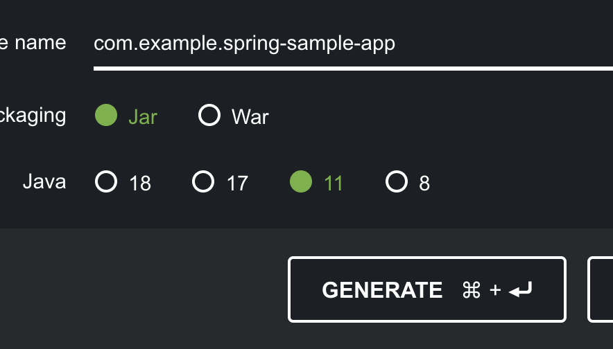 Then click on Generate, this will create the project and download it as zip fileunzip spring-sample-app.zip && cd spring-sample-app/ and replace build.gradle file with the following content