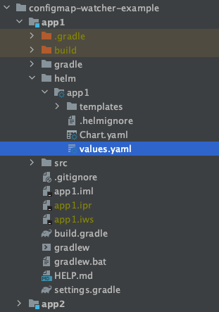 Create two SpringBoot applications , lets call them app1 and app2 and also create Helm charts for each application with the same name. Here is how the setup should look like: